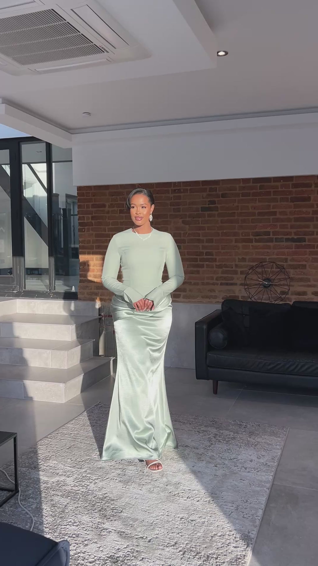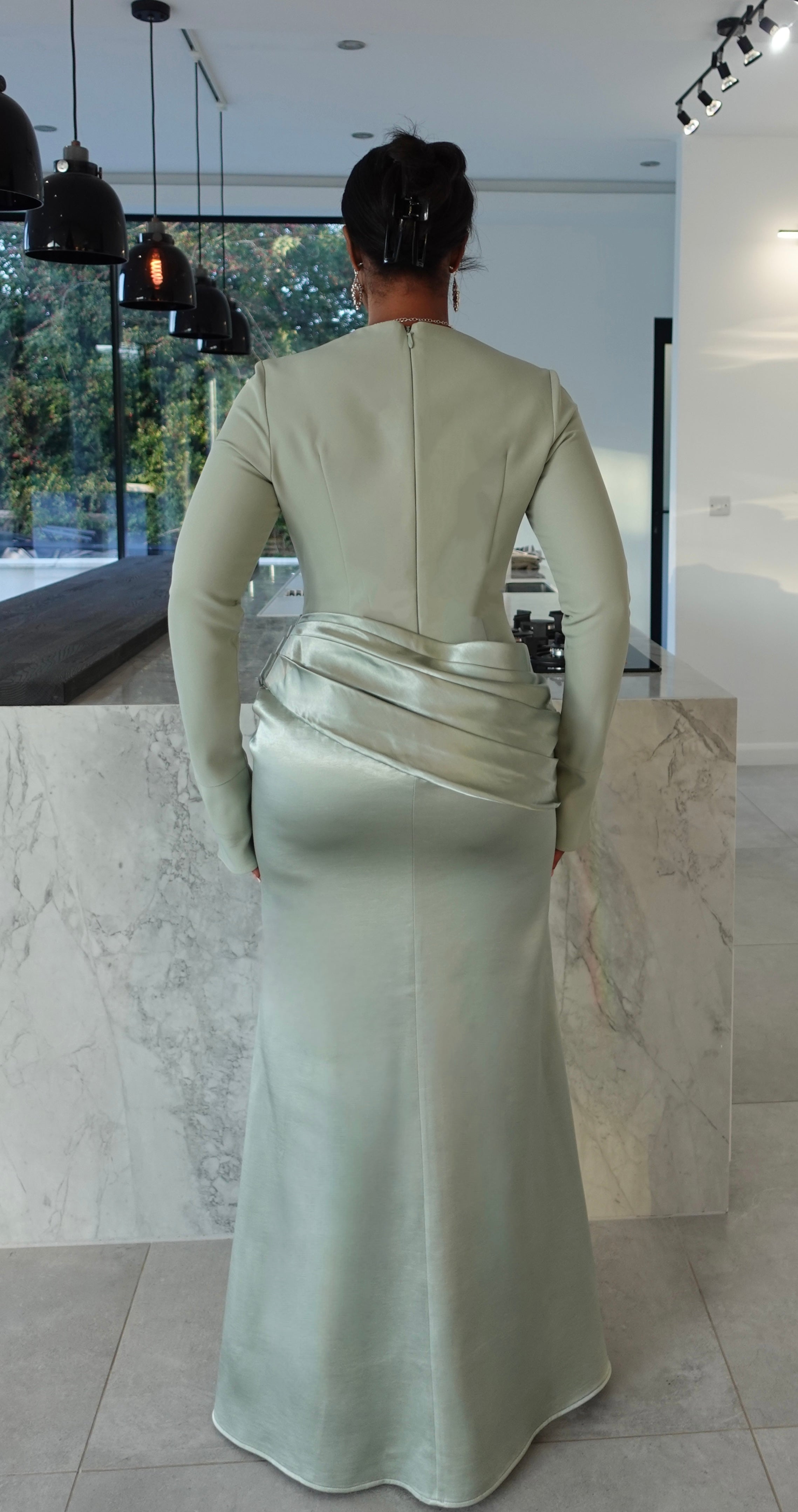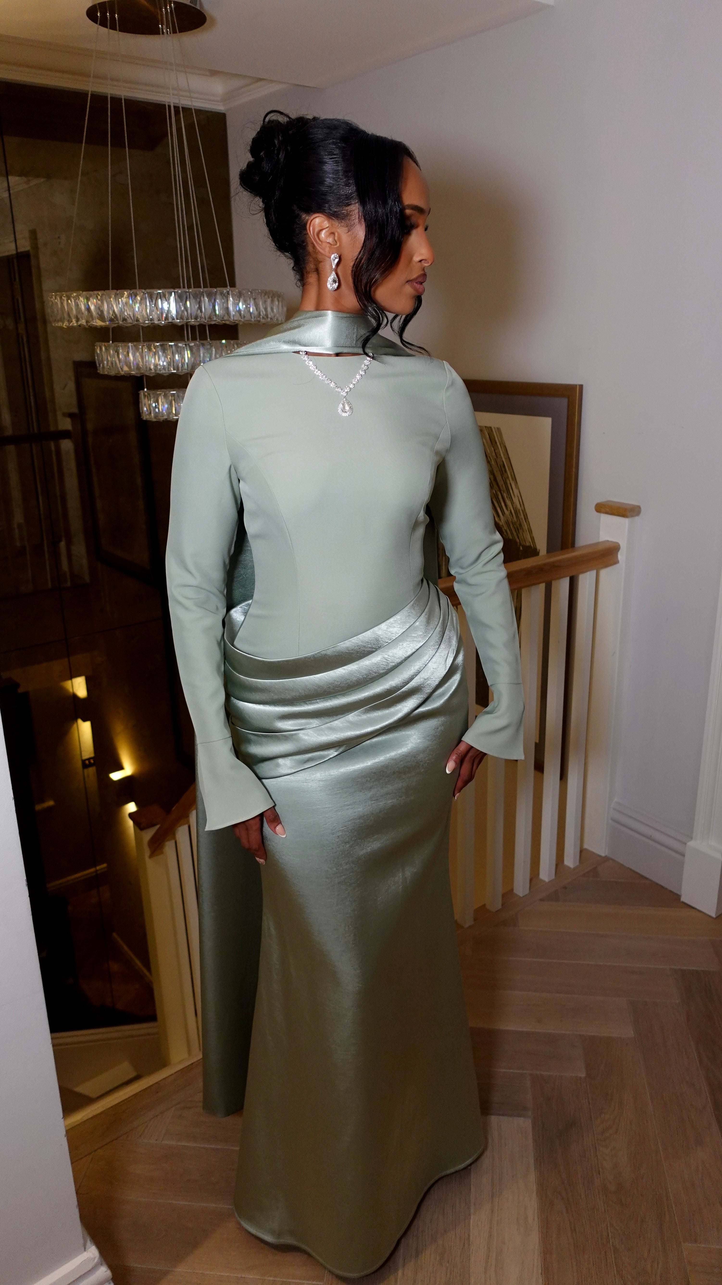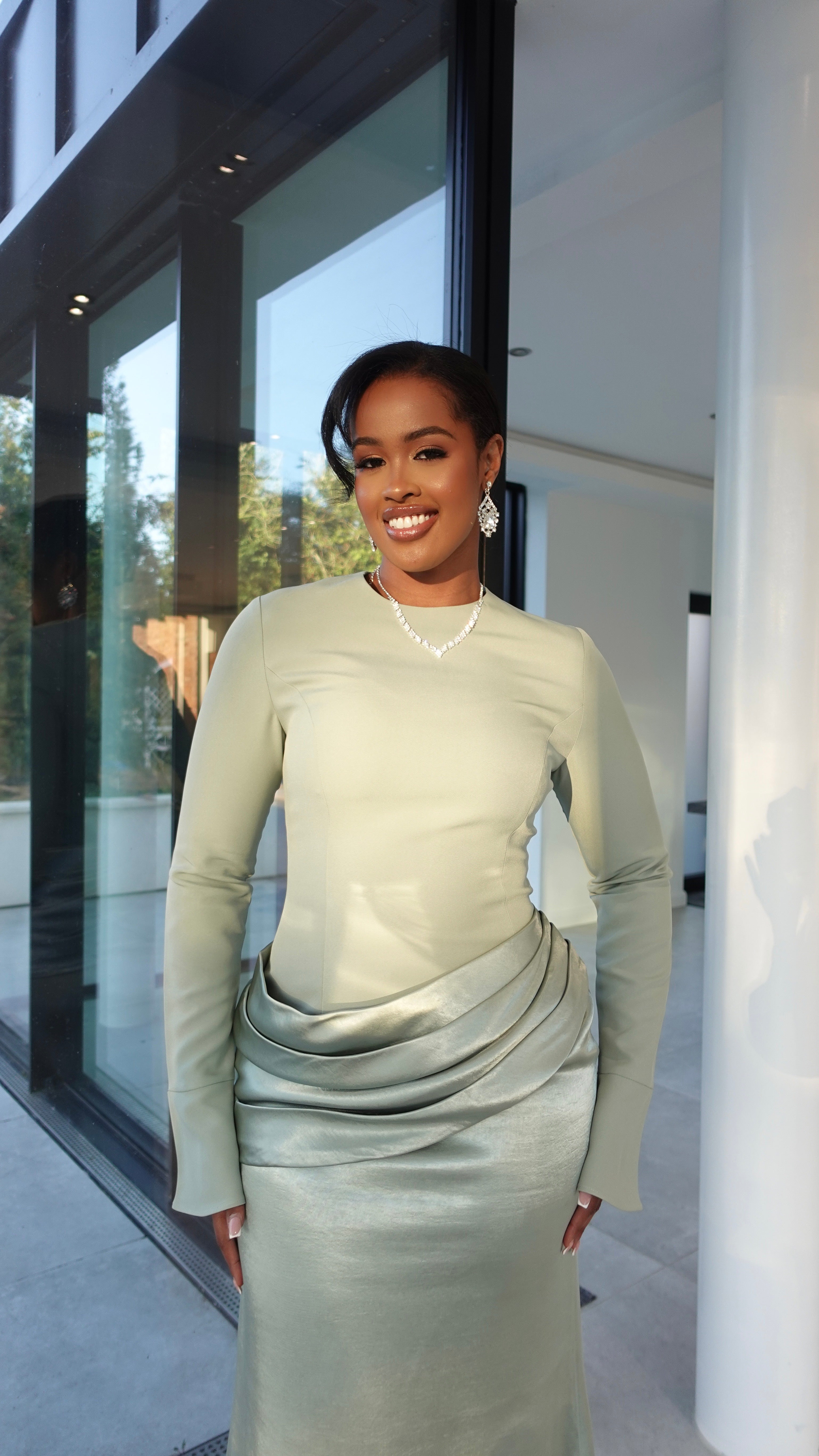 The top is crafted from a premium blend of viscose and spandex for a structured yet flattering finish, fully lined with satin for that soft touch against the skin. The bottom is made from 100% Dutchess satin with a rich, glossy drape that flows gracefully with every step.